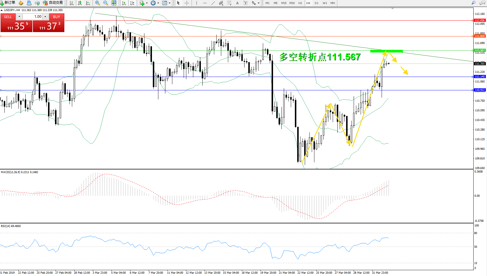 交易策略:111.567下方看跌,目标111.140、110.922
