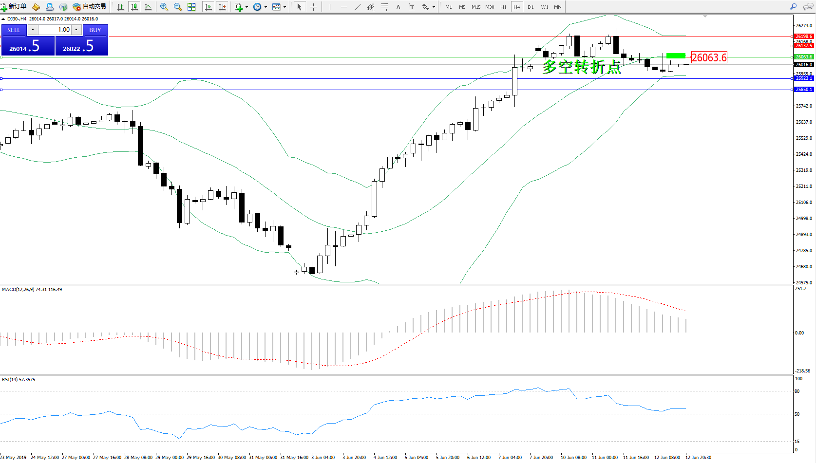道琼斯指数DJ30—— 4小时K线图显示: