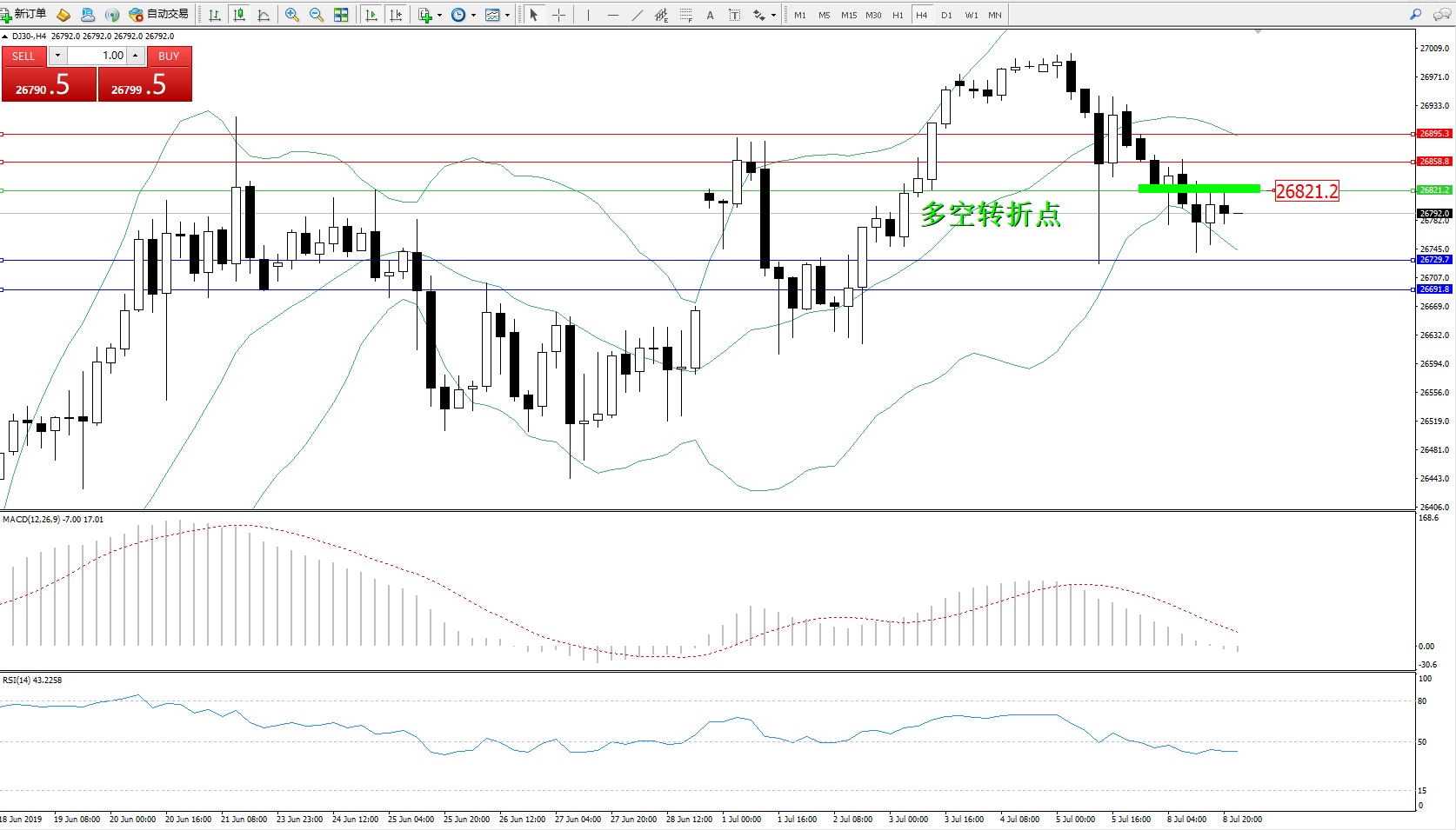 道琼斯指数DJ30—— 4小时K线图显示: