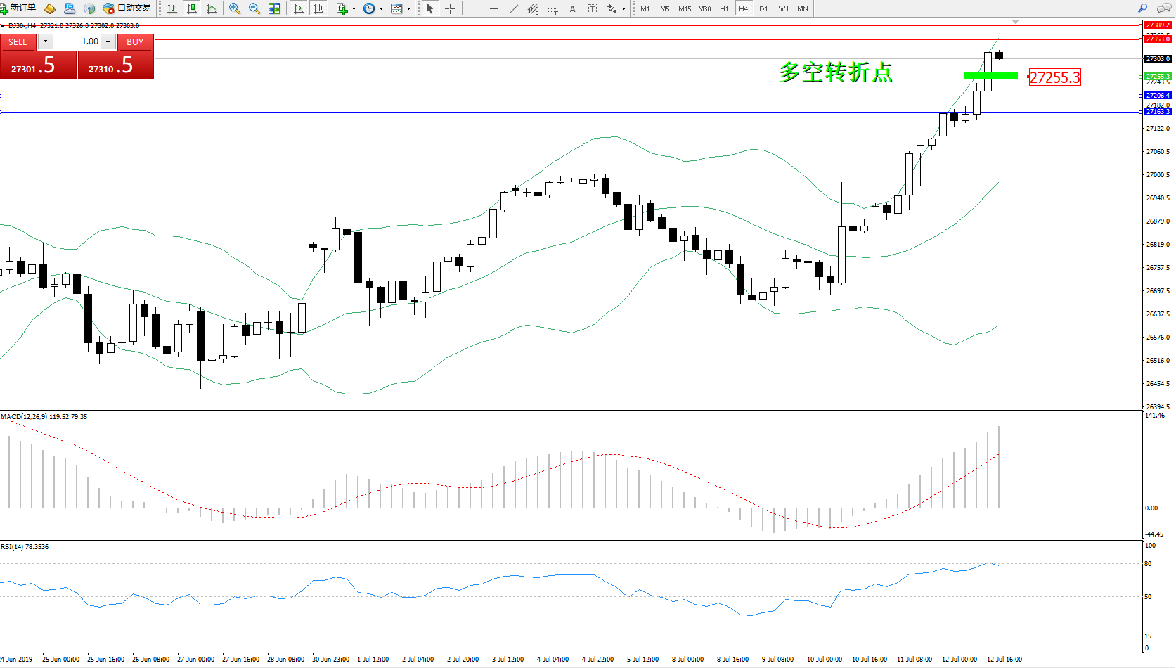 道琼斯指数DJ30—— 4小时K线图显示: