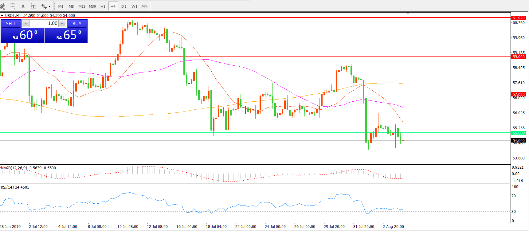 受中美贸易摩擦升级的影响,大宗商品市场周一继续下跌,美国WTI原油周一收跌震荡下行最终收报54.17美元/桶。中美贸易摩擦可能会抑制两个全球最大经济体对燃料的需求,同时中美贸易问题和人民币贬值引爆了市场的恐慌情绪,风险资产大幅下跌,美国三大股指惨遭“血洗”,经济放缓阴云再次笼罩全球。