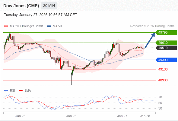 在 49300 之上,看涨,目标价位为 49610 ,然后为 49795 。
