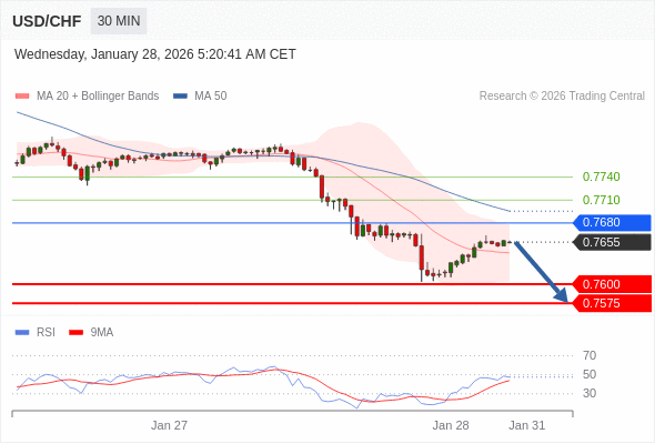 在 0.7680 之下,看跌,目标价位为 0.7600 ,然后为 0.7575 。