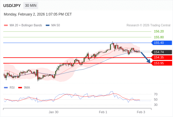 交易策略: 在 155.40 之下,看跌,目标价位为 154.35 ,然后为 153.95 。