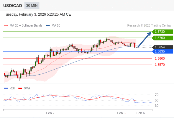 在 1.3635 之上,看涨,目标价位为 1.3700 ,然后为 1.3730 。