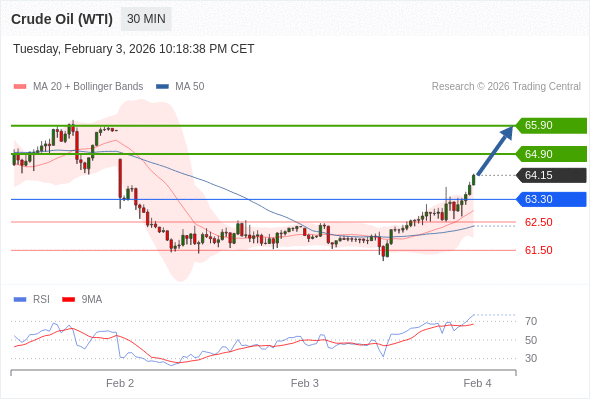 在 63.30 之上,看涨,目标价位为 64.90 ,然后为 65.90 。