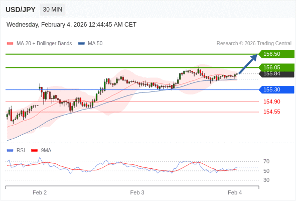 在 155.30 之上,看涨,目标价位为 156.05 ,然后为 156.50 。