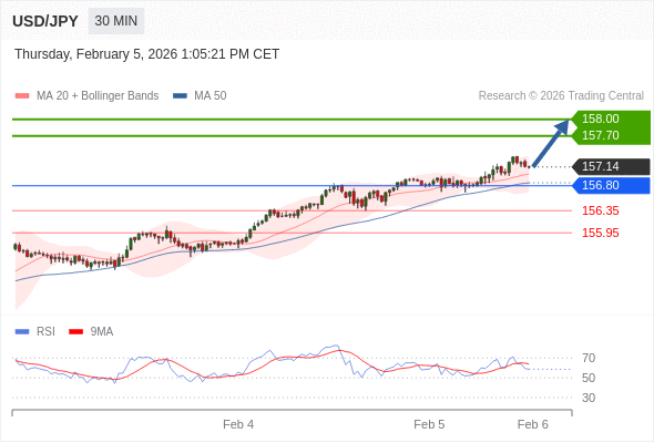 在 156.80 之上,看涨,目标价位为 157.70 ,然后为 158.00 。