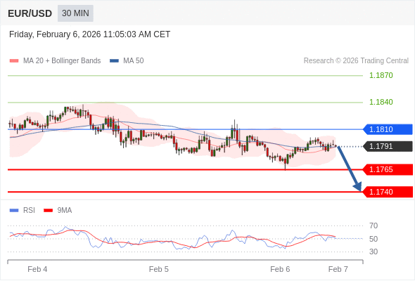 欧元/美元 当日内: 短期关键阻力位在1.1810。