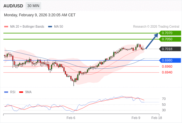 在 0.6980 之上,看涨,目标价位为 0.7050 ,然后为 0.7070 。