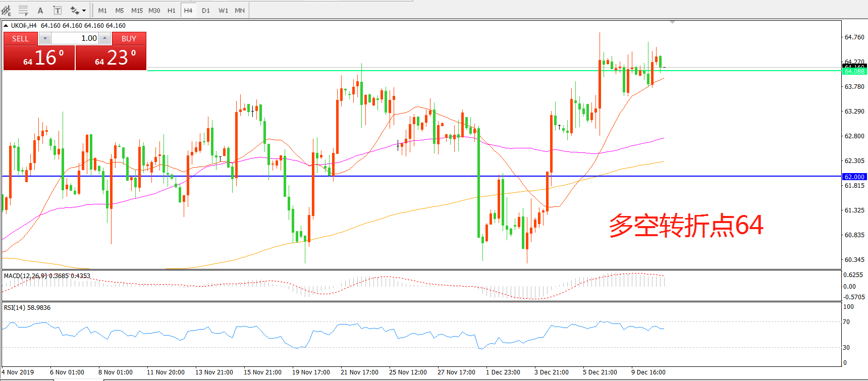 4小时图看,油价延续震荡上行,突破并站稳64.11一线,短期走势偏强,均线系统走平,MACD红柱减少,RSI指标走平,日内延续上行概率较大。