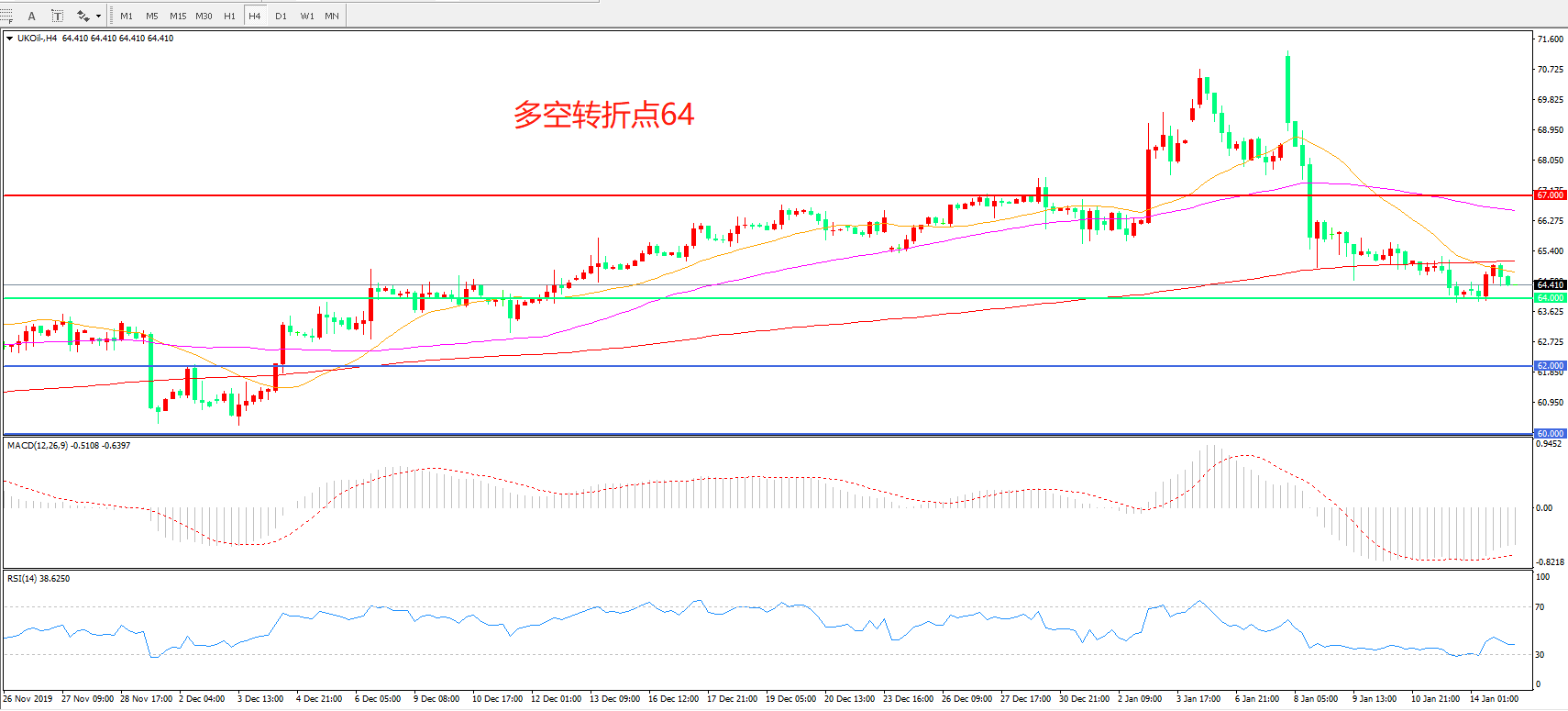 交易策略:在64.00之下看跌,目标62.00    60.00