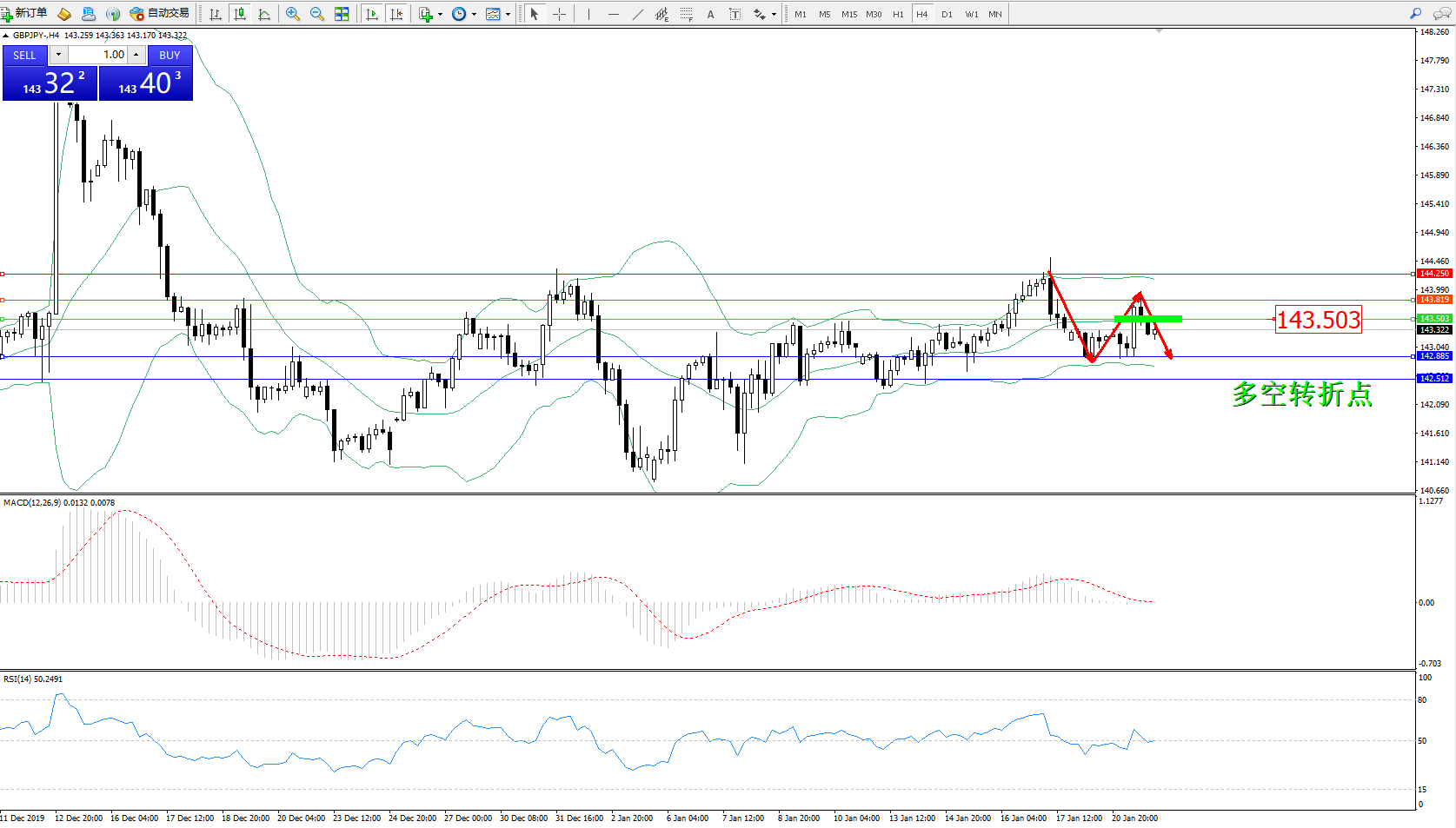 备选策略:143.503上方看涨,目标143.819144.250