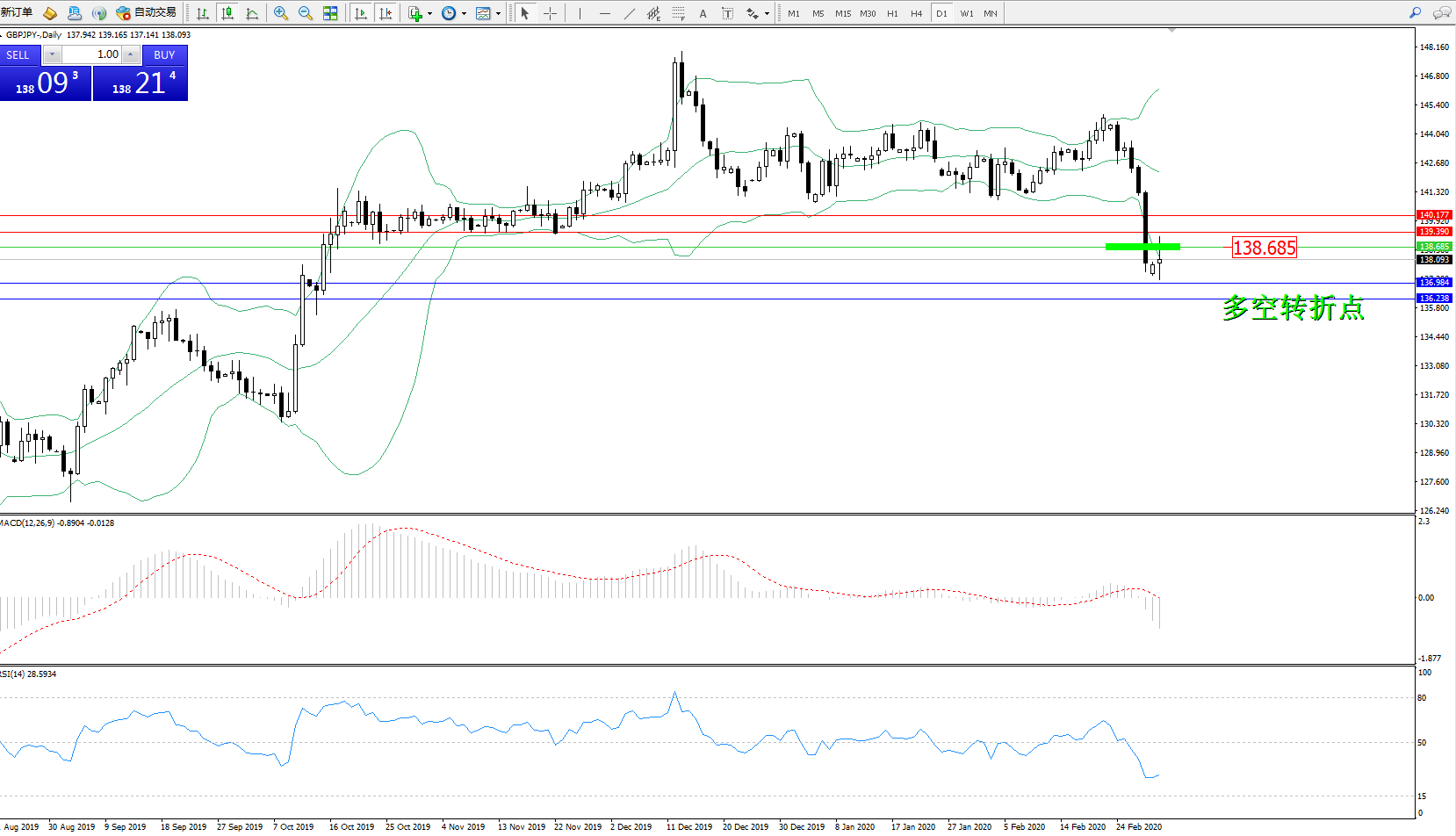 交易策略:138.685下方看跌,目标136.984136.238