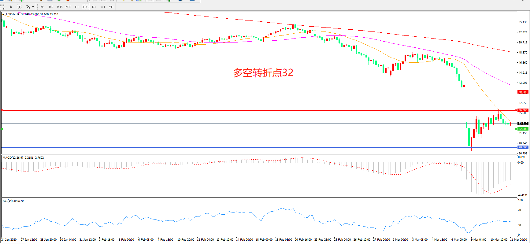 4小时图看,美油震荡上行,触碰36美元后回落,32美元成为短线支撑,均线系统呈空头排列,MACD绿柱减少,RSI指标走平,日内日延续震荡概率较大,中期走势仍然偏空。