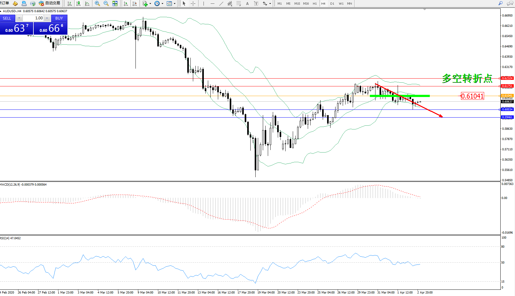 交易策略:0.61041下方看跌,目标0.60034、0.59461