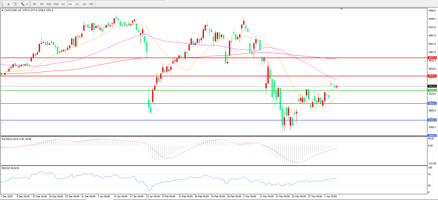 4小时图看,标普500震荡走高,短期走势有所回暖,200周期均线成为下方支撑,MACD红柱增加,RSI指标走平,日内震荡上行概率较大。