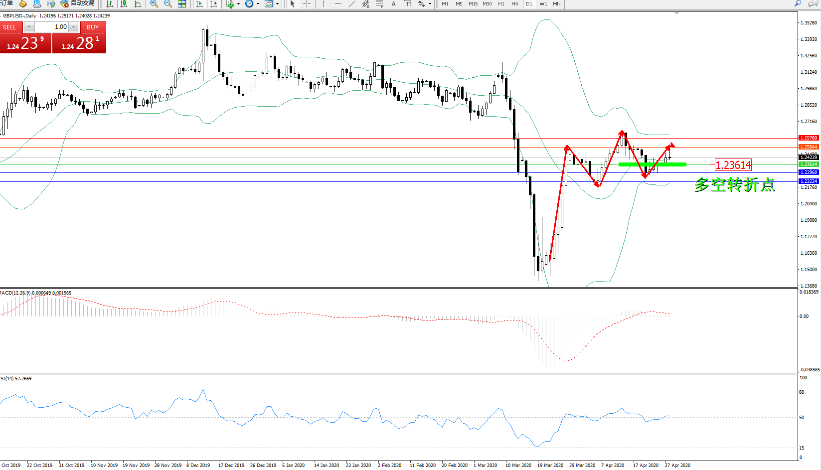 交易策略:1.23614上方看涨,目标1.25044、1.25780