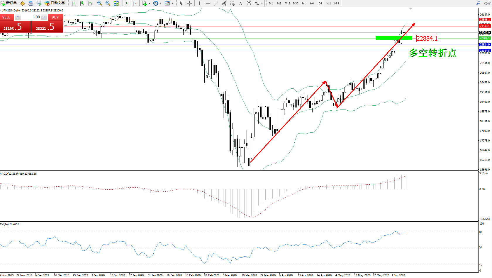 技术点评:多头动力延续布林带指标上轨不断震荡上扬中,布林带指标呈张口走势态势良好,多头动力有进一步上行态势,前期高位附近支撑现在转为关键压制节点,MACD指标处于0轴线上方多头区域持续震荡上移中,RSI指标处于多头区域超买区80均衡线附近持续徘徊中;