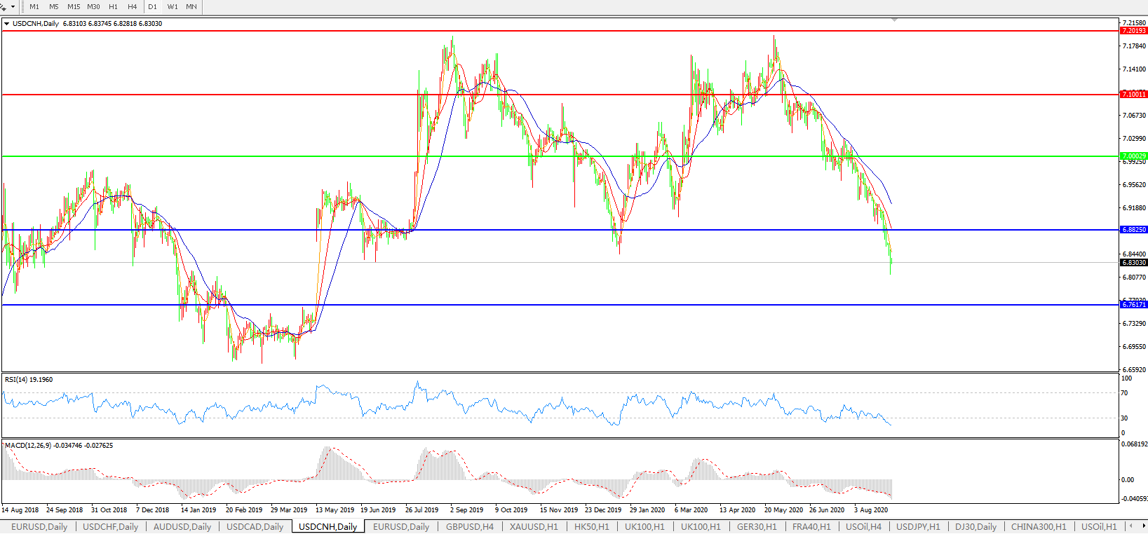 技术面简析:日图均线整体呈空头排列,汇价加速下行后有止跌迹象出现,MACD运行于0轴下方且量能放量,RSI持续走低,预计短期汇价大概率将进一步下行。