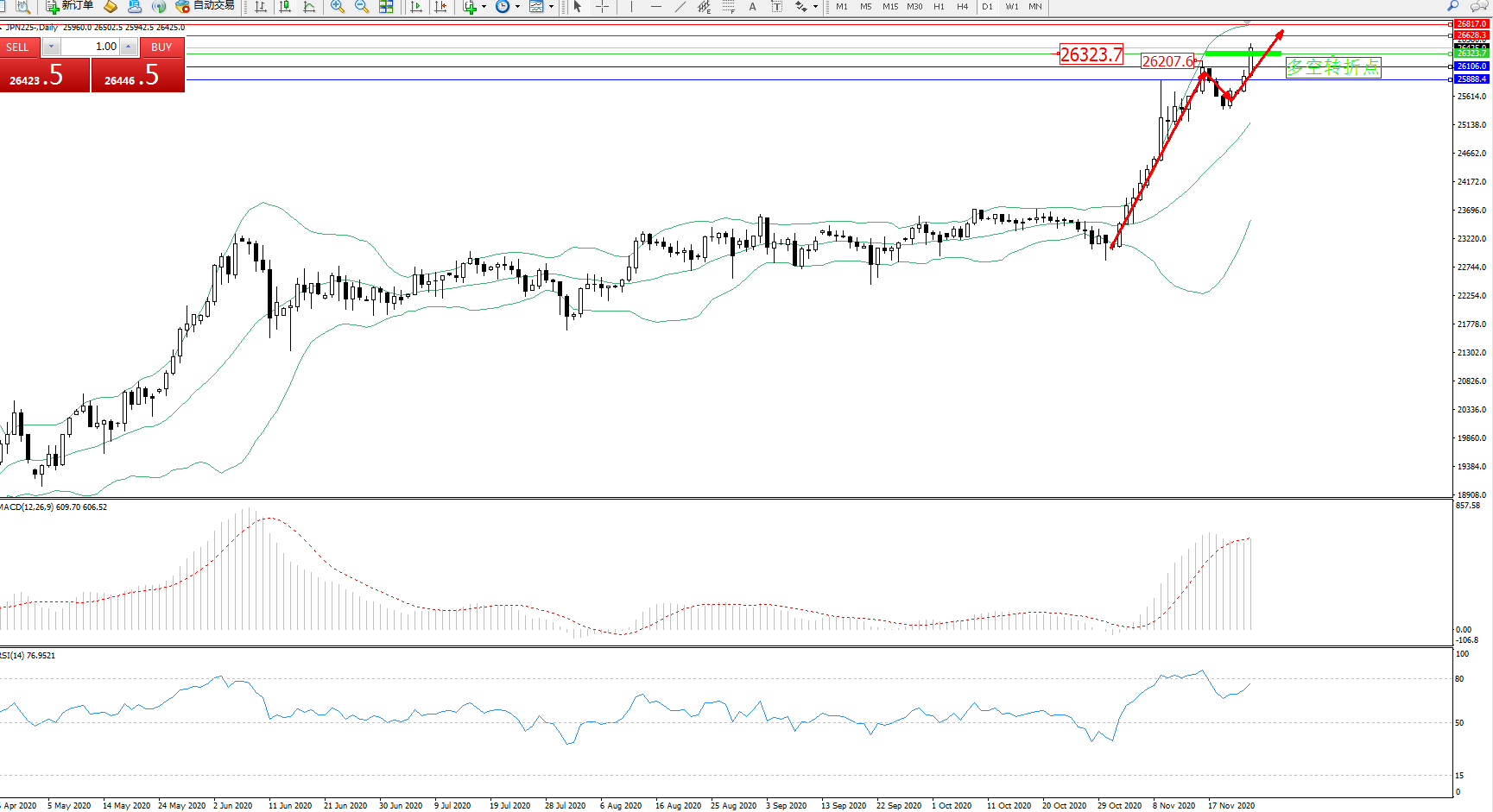 技术点评:多头动力延续布林带指标上轨附近持续震荡上扬态势良好,高位短暂回撤后再度强势拉升,突破前期高位26207位置后有继续拉升态势,布林带指标呈收口走势后持续向上移动中,MACD指标处于多头区域高位持续整理平移中,RSI指标处于多头区域高位短暂回撤后出现缓慢整理上移;