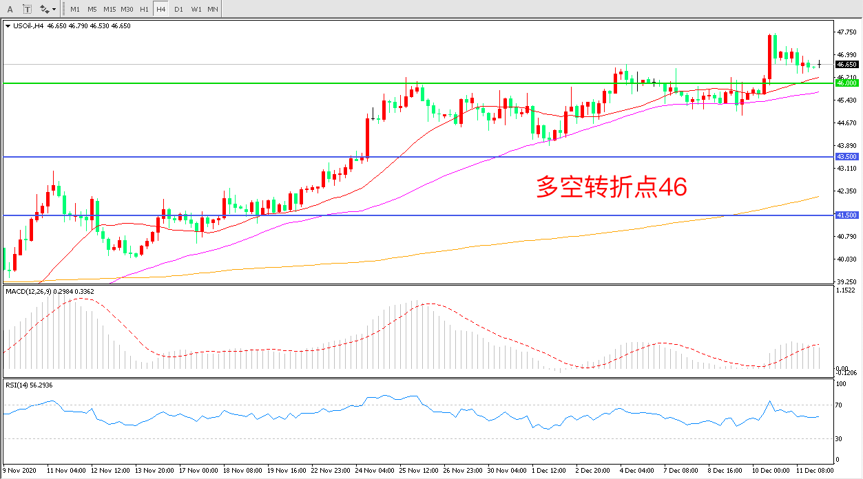 4小时图看,油价长阳突破后出现短暂回调近期涨势有所放缓但整体价格区间依然运行在46美元之上均线系统成为下方支撑MACD红柱减少RSI指标走平,日内震荡上行概率较大。