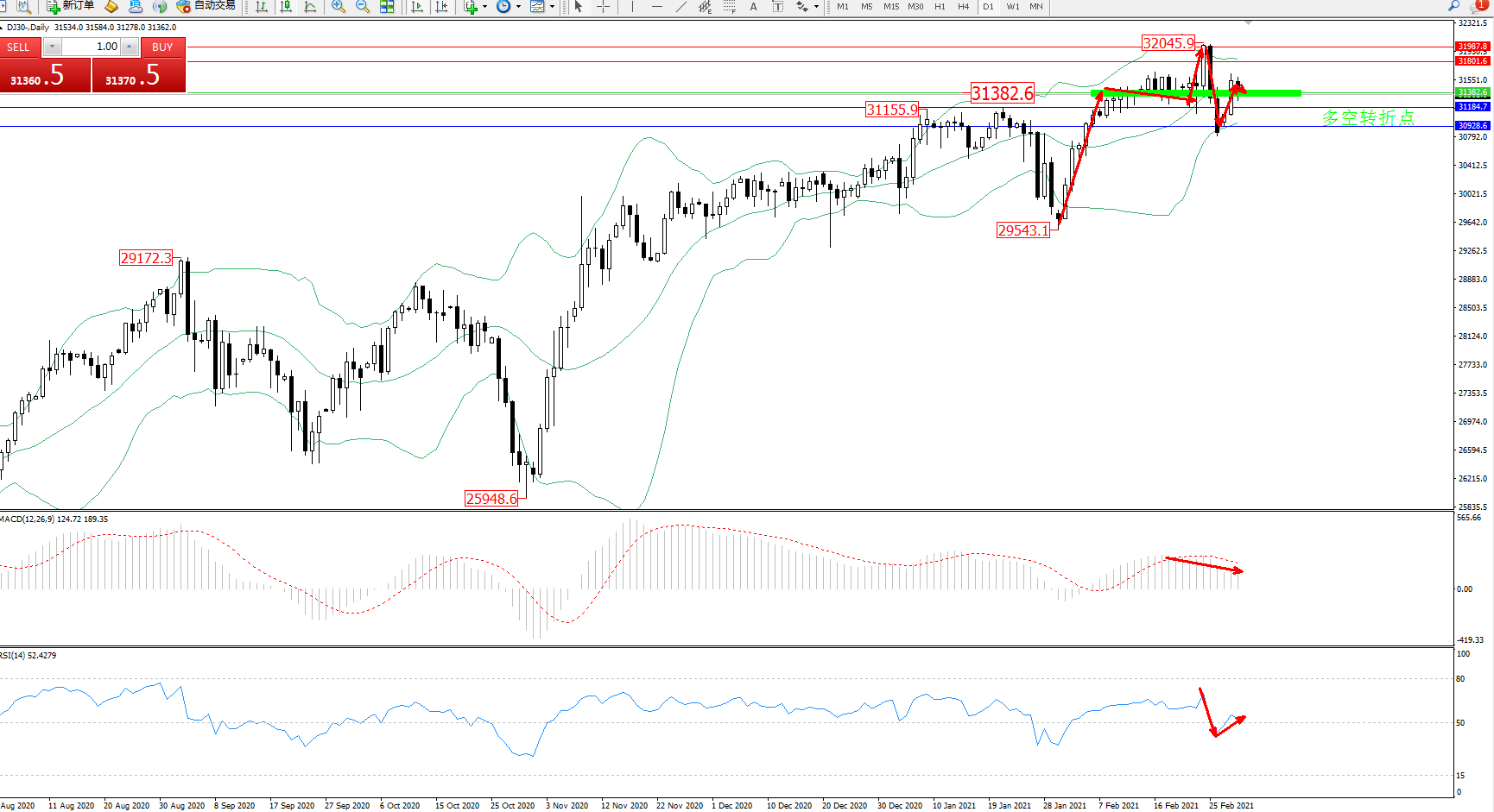 交易策略:31382上方看涨,目标31801、31987
