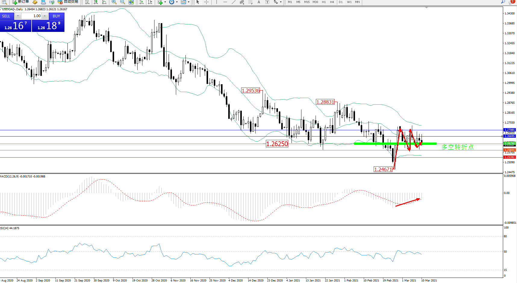 技术点评:空头动力延续布林带指标通道中下轨区间持续震荡下行,低位抵达1.24671位置后得到支撑强势反转上扬,突破布林带指标中轨附近节点后开始维持在中轨附近来回宽幅震荡中,多空动力纠结于中轨位置附近维持弱势震荡中,布林带指标呈张口走势后开始收口平移,关注中下轨附近节点,MACD指标处于空头区域低位维持震荡向上移动中,RSI指标处于50均衡线附近维持窄幅整理平移中;