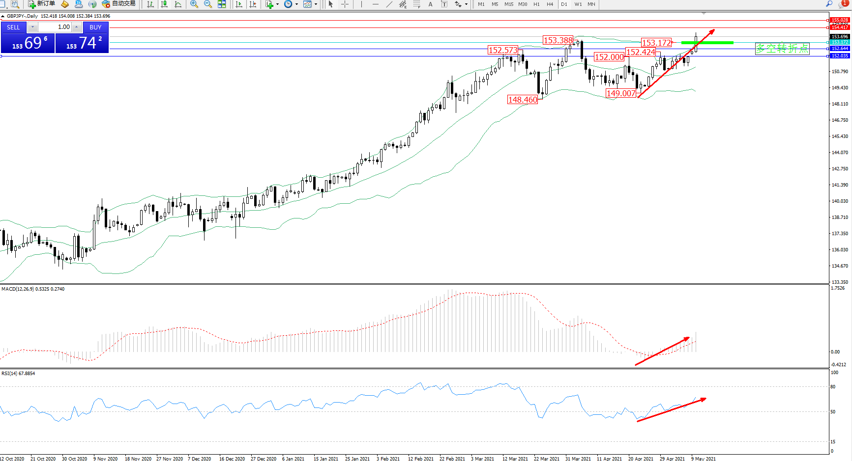 技术点评:长时间维持在布林指标通道宽幅震荡整理持续平移中,延续中上轨区间持续震荡向上移动态势良好,突破前期高位153.388位置后有继续拉升态势,布林带呈张口走势中,MACD指标处于0轴线上方弱势向上移动中,RSI指标处于50均衡线上方震荡拉升中;