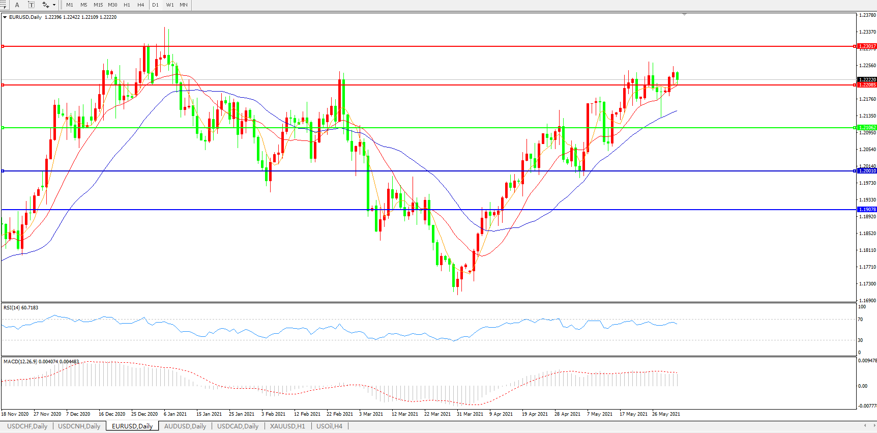 欧元兑美元小幅下跌0.02%,至1.2211,从隔夜触及的1.22545美元的近数月高点回落;若跌破21日移动均线所在1.2164和4月29日高点1.2150,可能预示进一步下跌。数据显示,4月欧元区生产者物价指数升幅高于预期,受能源成本飙升提振。但欧洲央行表示,尽管今年通胀率可能会暂时高于目标,但工资增长乏力可能会让通胀率在未来几年保持在可控水平。欧洲央行希望在中期内将消费者物价增幅保持在接近2%的水平。