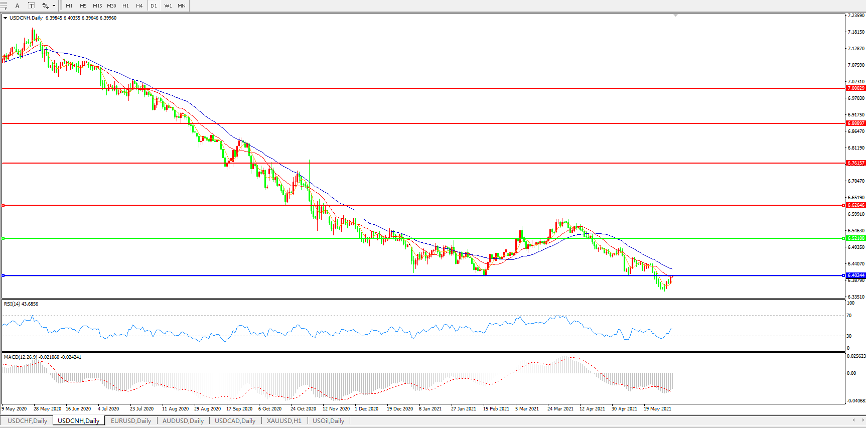 技术面简析:日线图均线有上行迹象,汇价开始逐步反弹,MACD运行于0轴下但量能快速缩量,RSI直线走强,预计短期汇价大概率将进一步反弹上行。