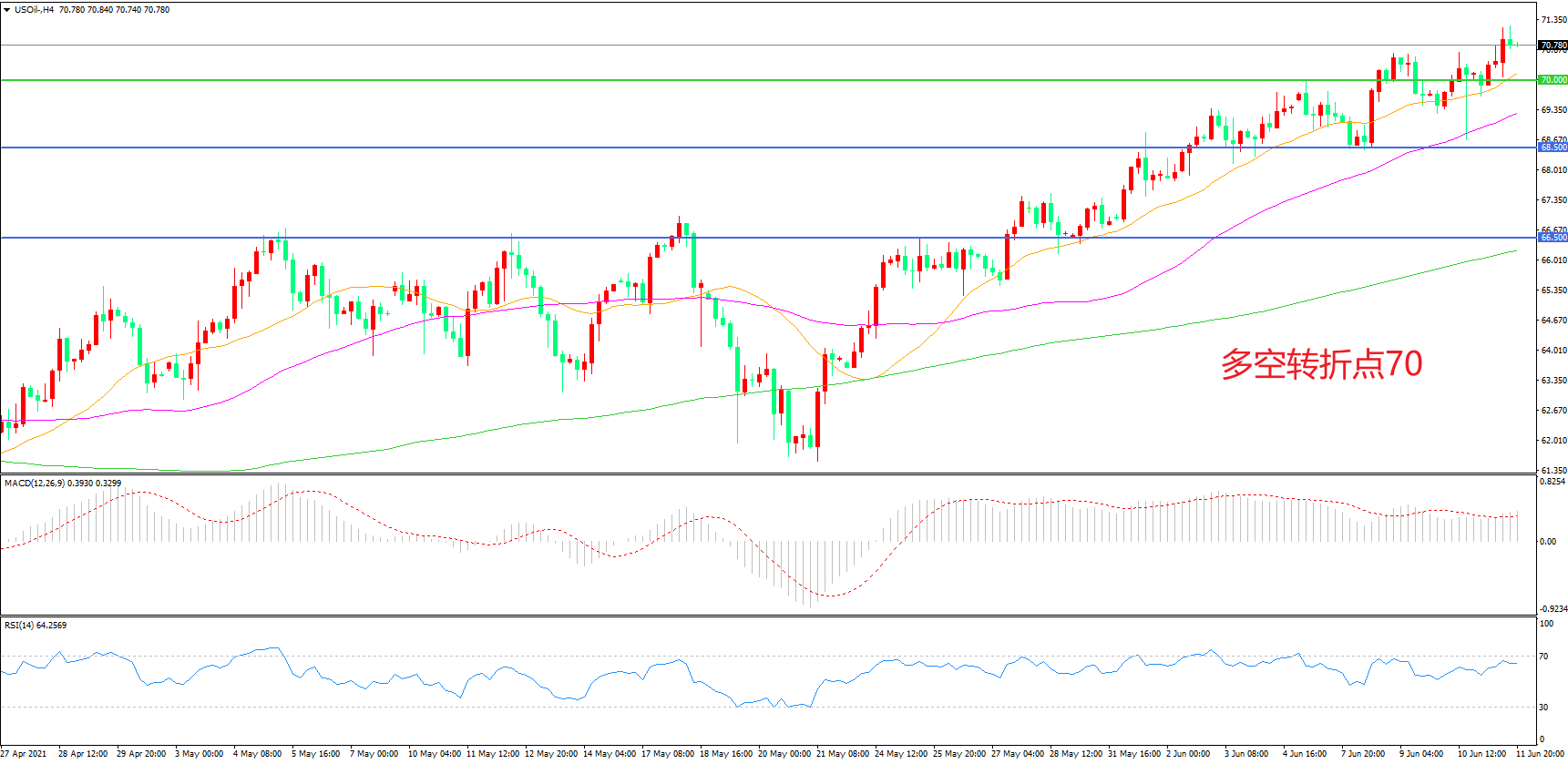 交易策略:在70.00之上看涨,目标72.00    75.00