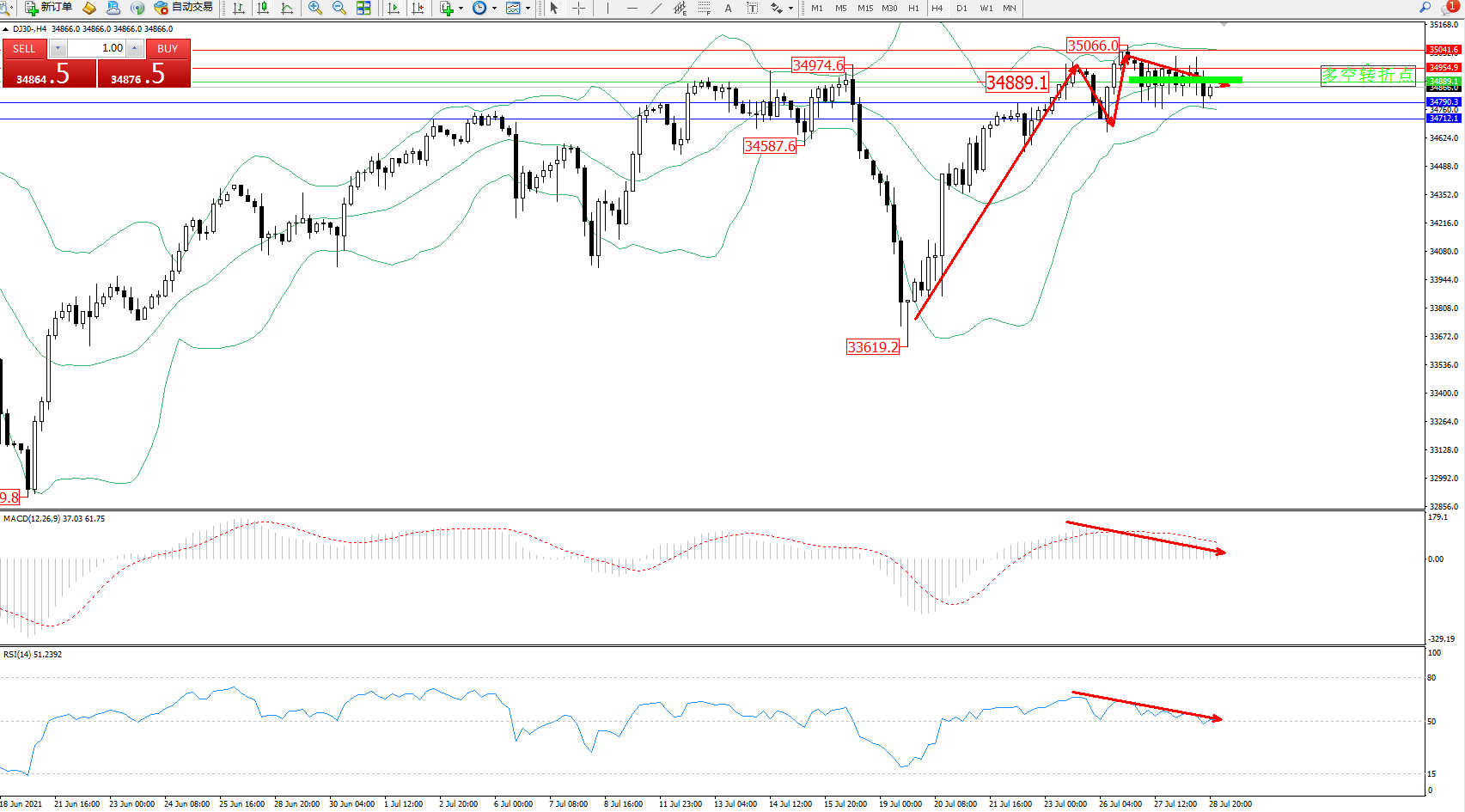 交易策略:34889下方看跌,目标34790、34712