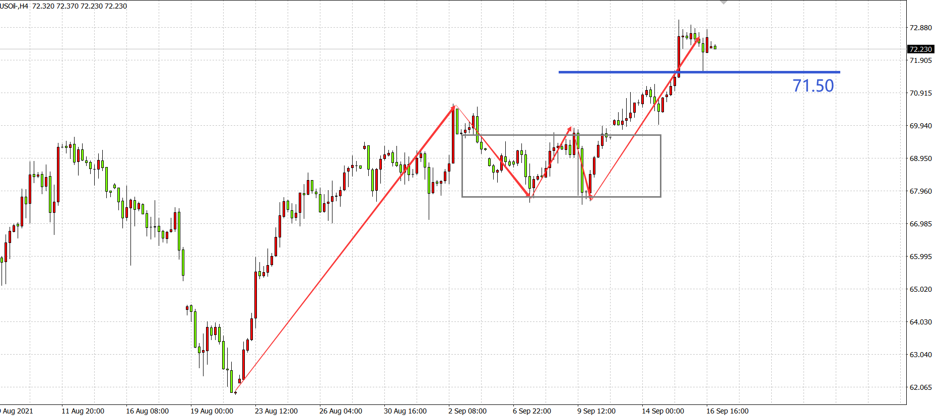 交易策略:在71.50之下看跌,目标70.50                69.30