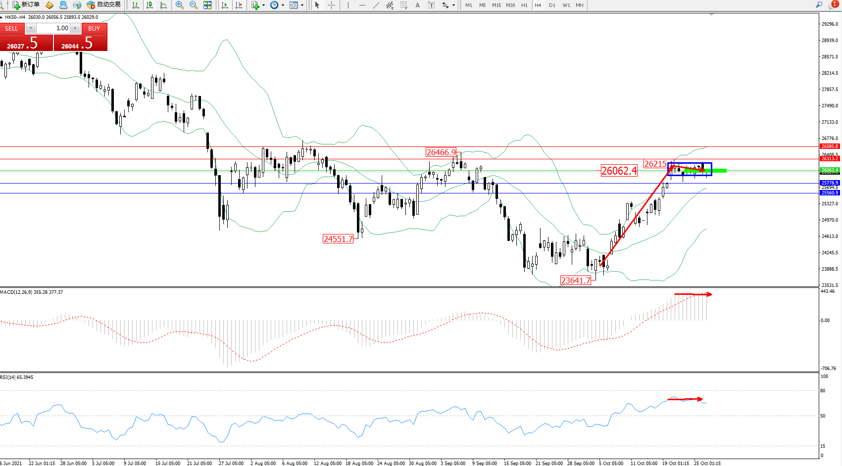 技术点评:低位多头动力延续布林带指标通道中上轨区间持续震荡上扬,高位抵达26215位置后开始整理平移,短期多空动力处于焦灼状态,布林带指标持续震荡上扬后开始整理平移,MACD指标处于多头区域高位整理平移中,RSI指标处于多头区域高位维持徘徊;