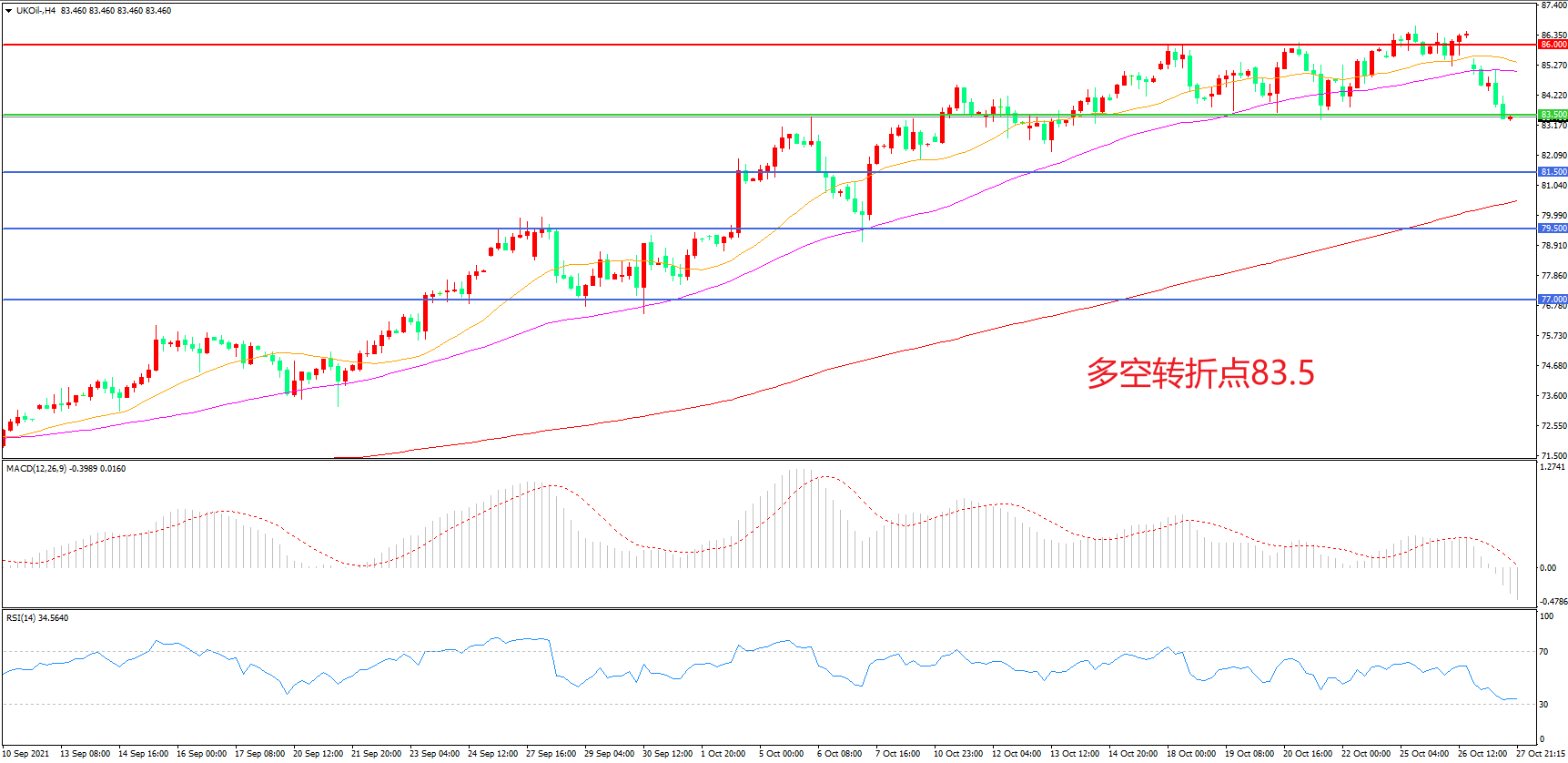 4小时图看,油价冲高回落,整体呈现区间震荡形态,86成为上方阻力,83.5成为下方支撑,MACD绿柱增加,RSI指标走平,日内延续震荡概率较大。