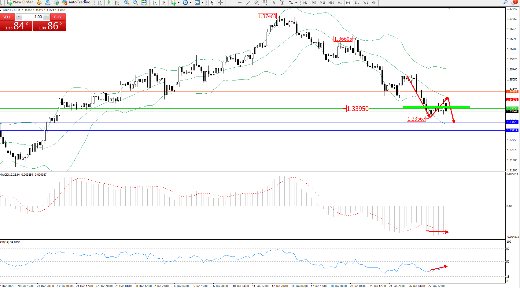 交易策略:1.33950下方看跌,目标1.33428、1.33114