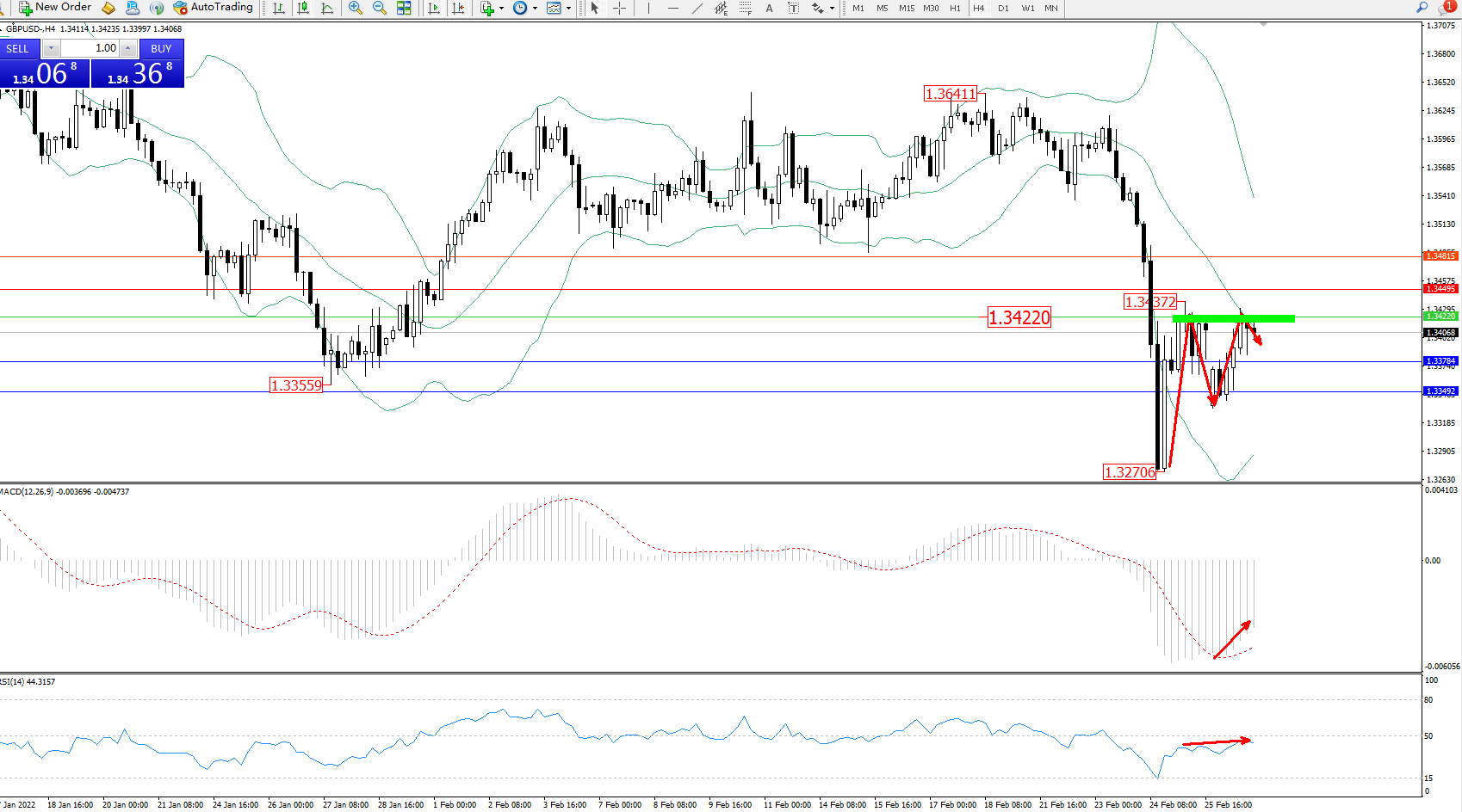 交易策略:1.34220下方看跌,目标1.33784、1.33482