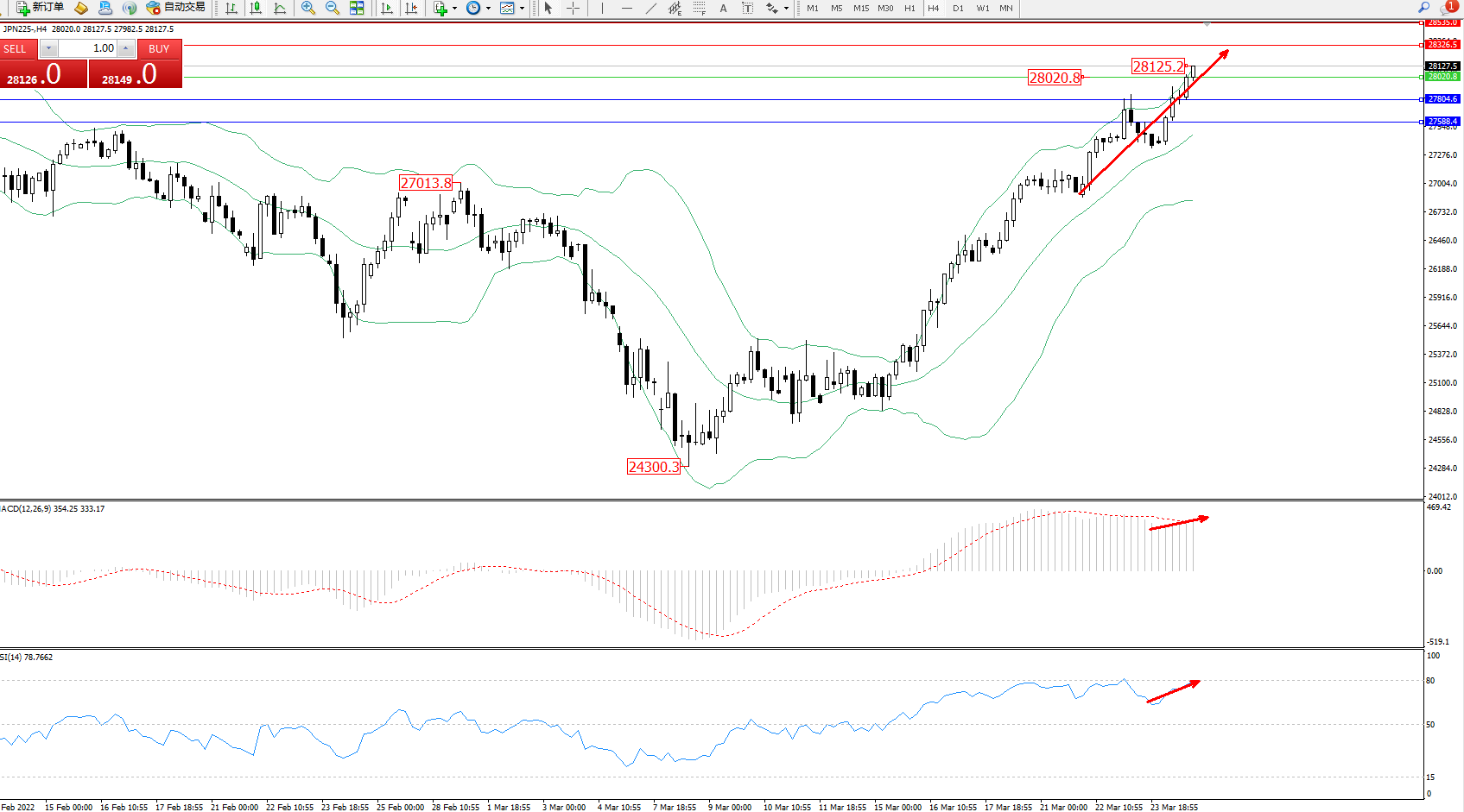 技术点评:多头动力延续布林带指标通道中上轨区间持续震荡上扬,高位抵达28125附近节点开始整理,短期多头上扬态势良好,且未见有止步迹象,布林带指标呈上行趋势走势持续中,且有缓慢张口迹象,MACD指标处于多头区域高位维持整理平移,RSI指标处于多头区域超买区80均衡线下侧震荡;