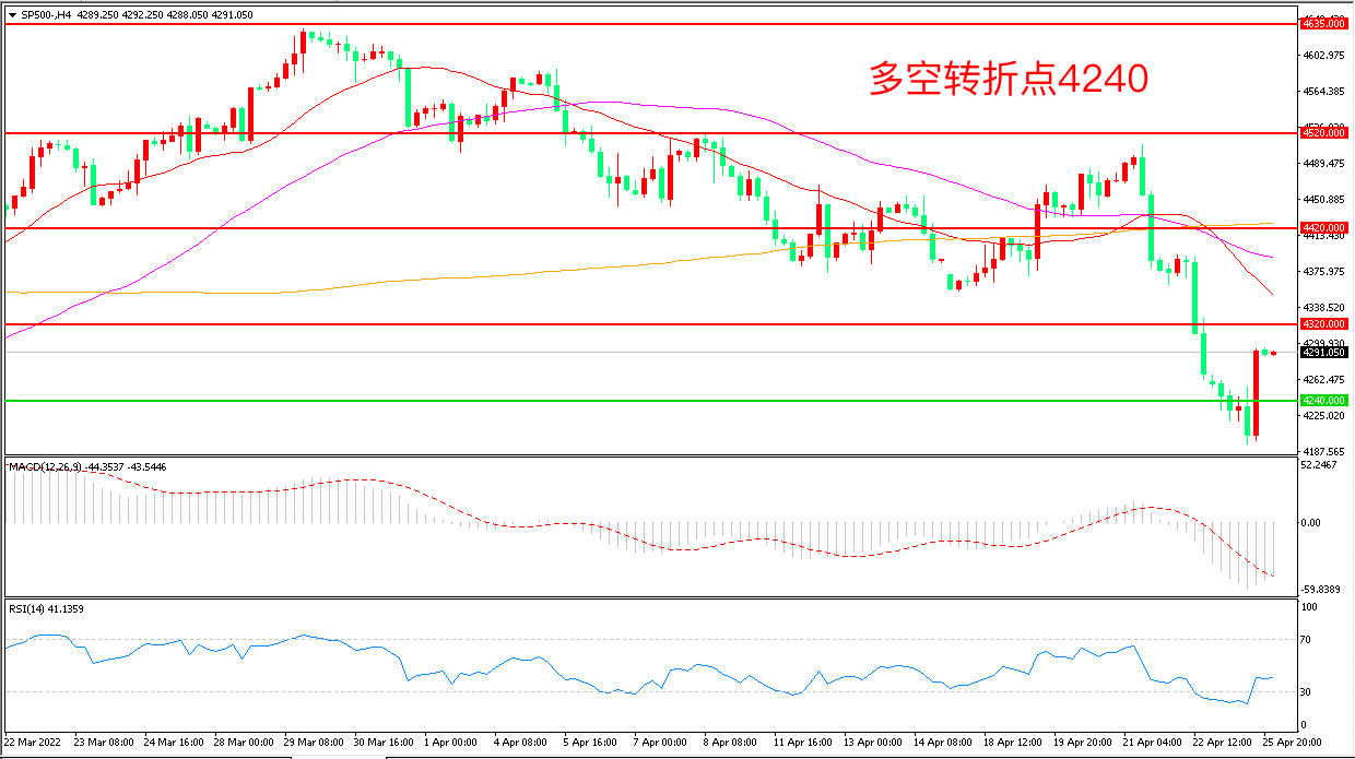 周一(4月25日),疫情令市场担心需求不振,加之美元走强施压,风险资产遭到集体抛售,美股一度大幅低开,但龙头科技股的强势推动反弹,标普500先跌后涨,收报4289.55点。有数据显示,近期投资者从美国大型股中撤出了196亿美元,为2018年2月以来规模最大的一次资金外流,美联储正处于上调官方利率和抽走流动性的初期阶段,标普500将持续承压。