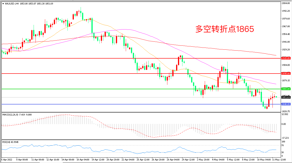 周三(5月11日),美国4月CPI同比增长8.3% ,处于40年高位附近,现货黄金走出深V走势,短线下挫15美元收复失地,报1852.16美元/盎司。虽然最新报告显示美国通胀可能已见顶,但CPI的数据博翱翔突显了经济中物价上涨的幅度,高通胀一方面对长期金价形成支撑,另一方面过高的通胀将强化美联储鹰派加息的政策倾向,多空博弈中,金价宽幅震荡概率较大。