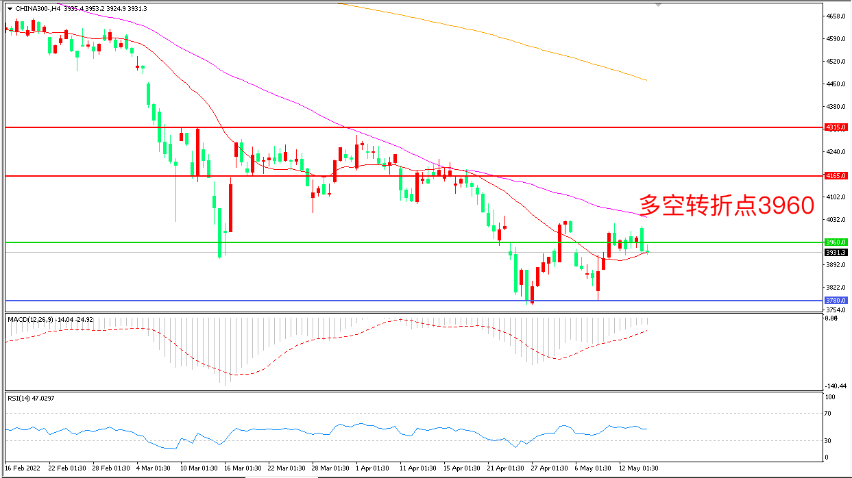 4小时图看,沪深300受阻于55均线后延续横盘震荡形态,多空博弈胶着,均线系统走平,3960成为多空分水岭,MACD绿柱缩短,RSI指标走平,日内冲高回落概率较大。