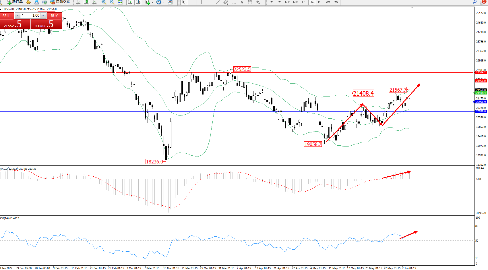 交易策略:21408上方看涨,目标21966、22364