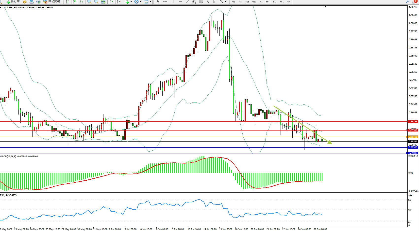 美元瑞郎USDCHF——4小时K线图显示: