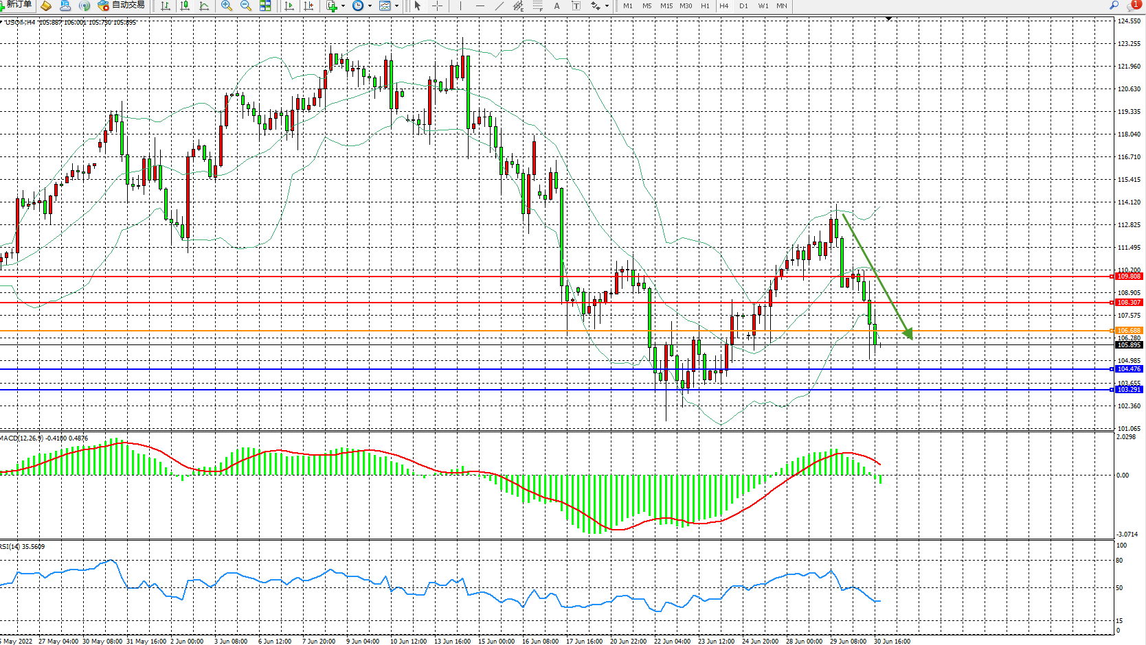 交易策略:106.688下方看跌,目标104.476、103.291