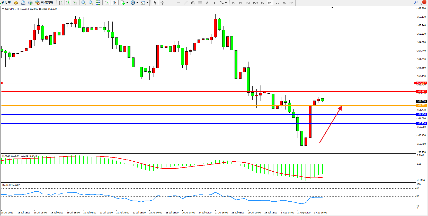 交易策略:161.652上方看涨,目标162.357、162.787