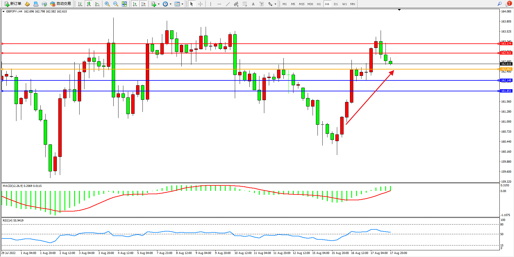 交易策略:162.462上方看涨,目标162.911、163.174