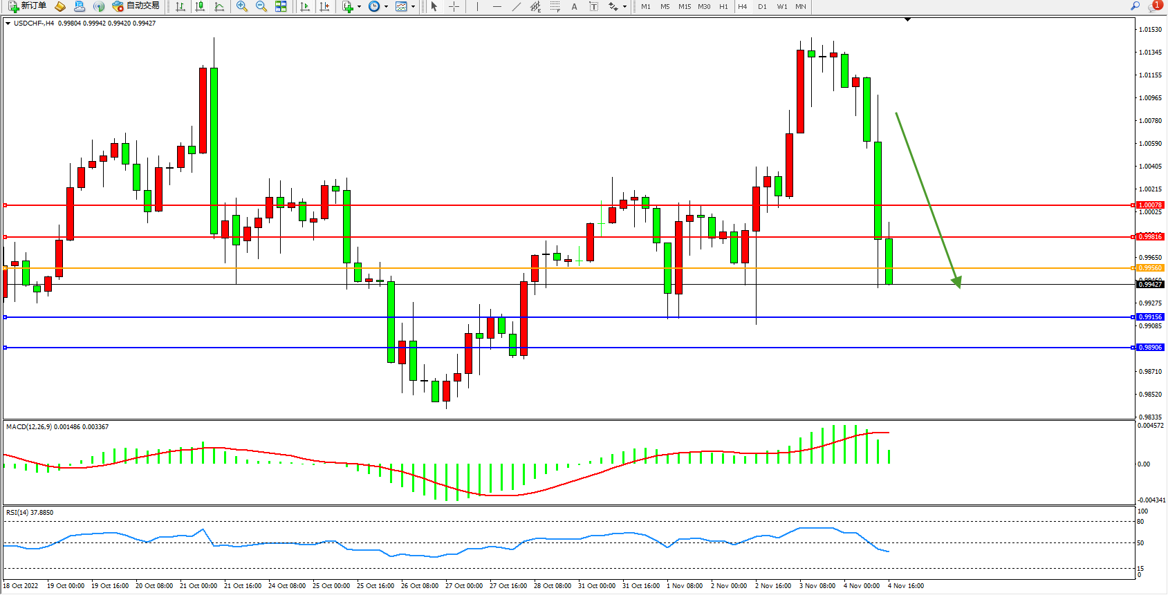 美元瑞郎USDCHF——4小时K线图显示: