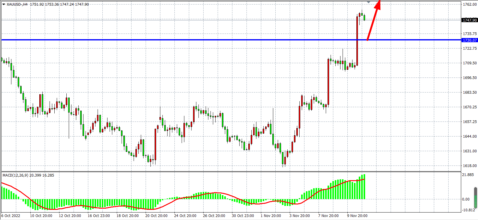 4小时图看,金价在1695之上延续涨势,最高涨至1757附近,MACD于零轴之上强劲放量,预示多头动能仍有进一步走强空间,前目支撑已上移至1730附近,日内在该位之上继续看涨,目标1760-1775。