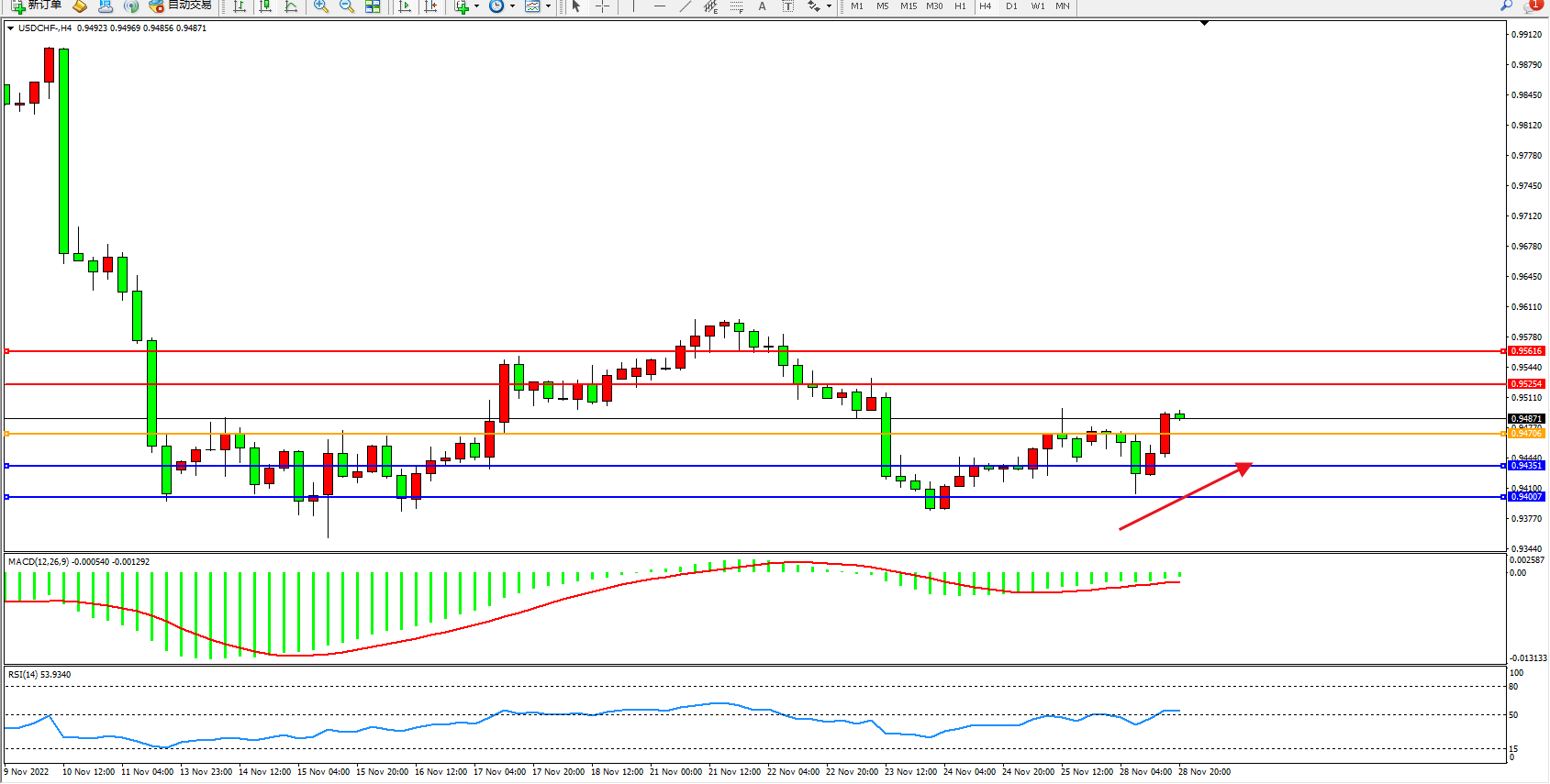 美元瑞郎USDCHF——4小时K线图显示:
